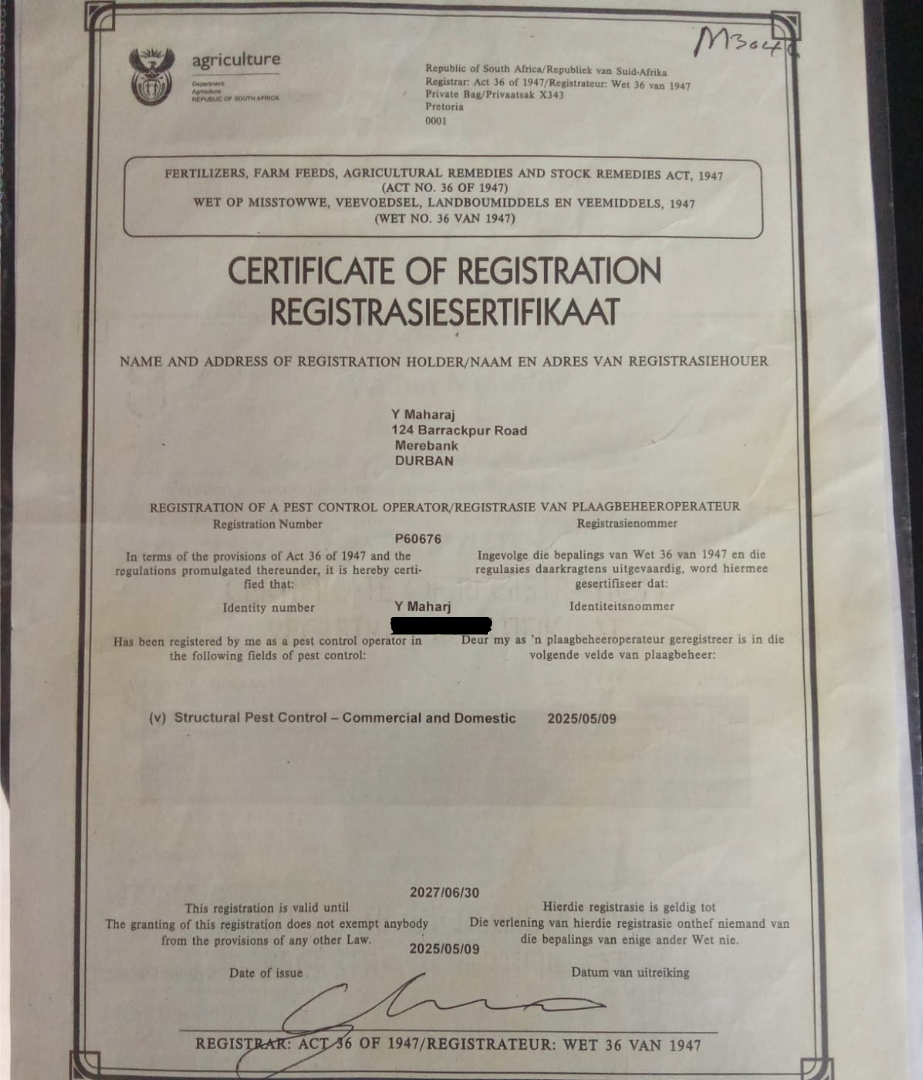 Metro Pest Control is a registered pest control operator in terms of the Fertilizers, Farm Feeds, Agricultural Remedies and Stock Remedies Act, 1947 (Act 36 of 1947). Our registration authorises us to provide structural pest control services for both residential and commercial environments.