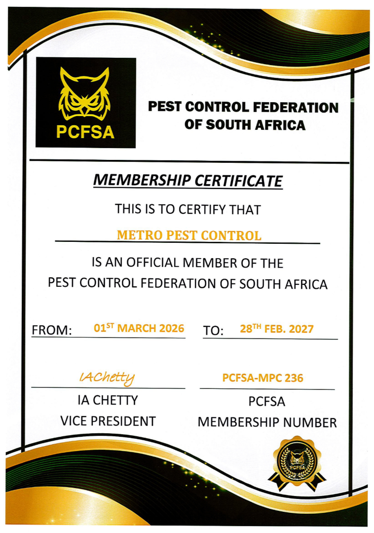 We are also a proud member of the Pest Control Federation of South Africa (PCFSA), demonstrating our commitment to professional pest management standards and responsible service delivery.